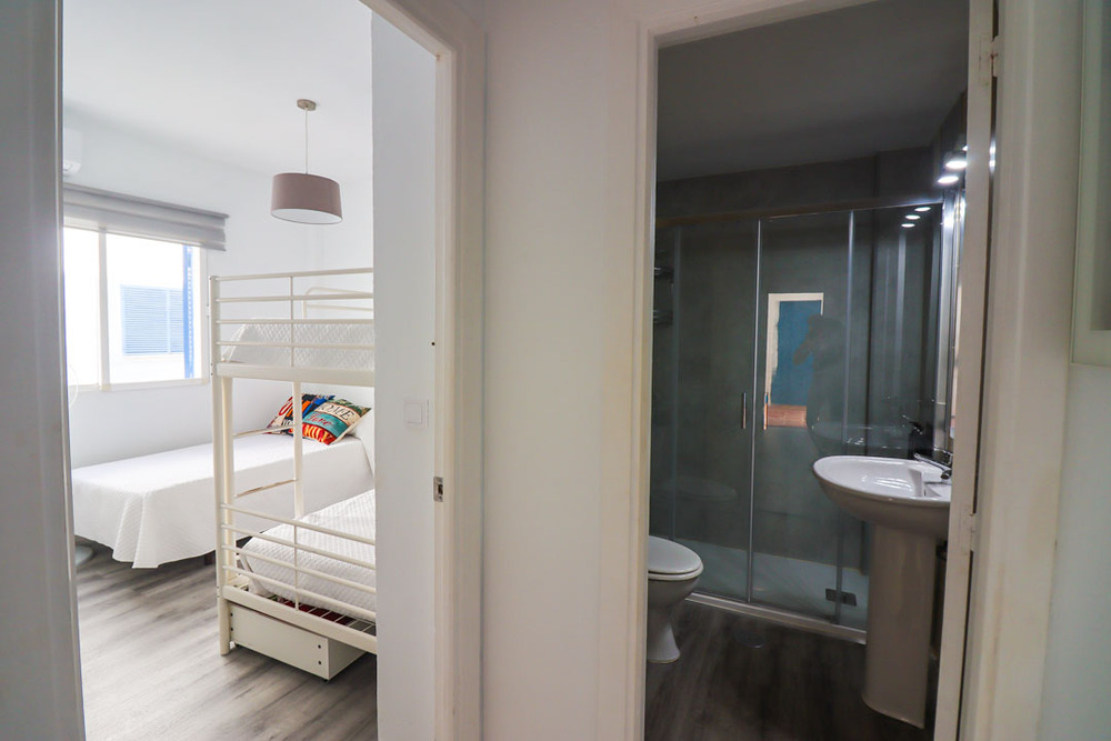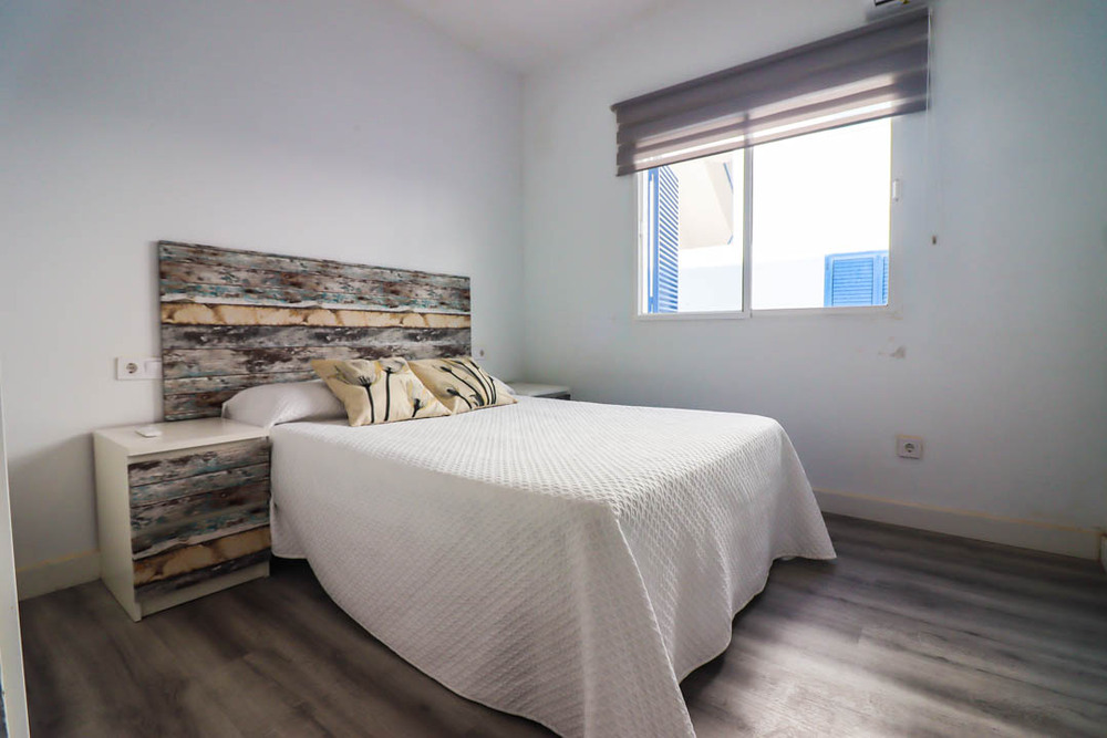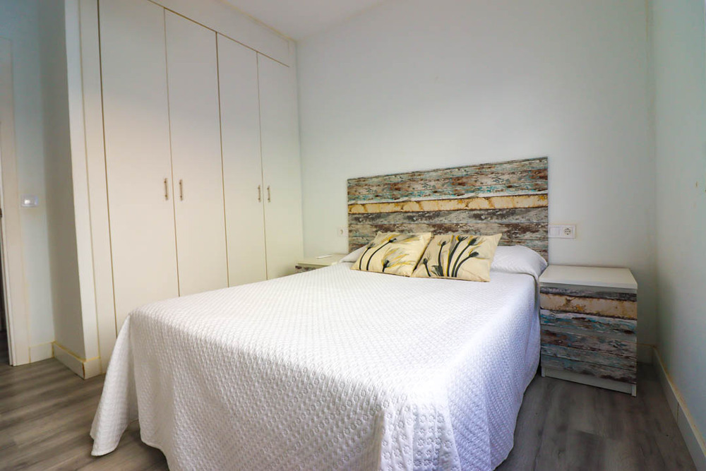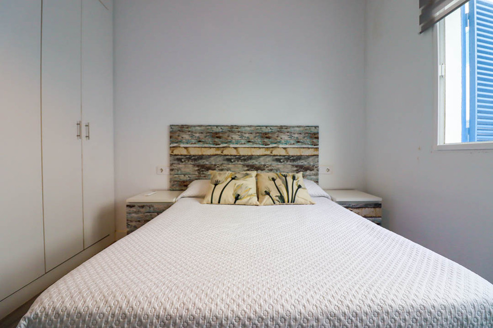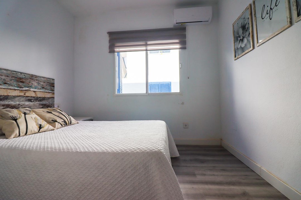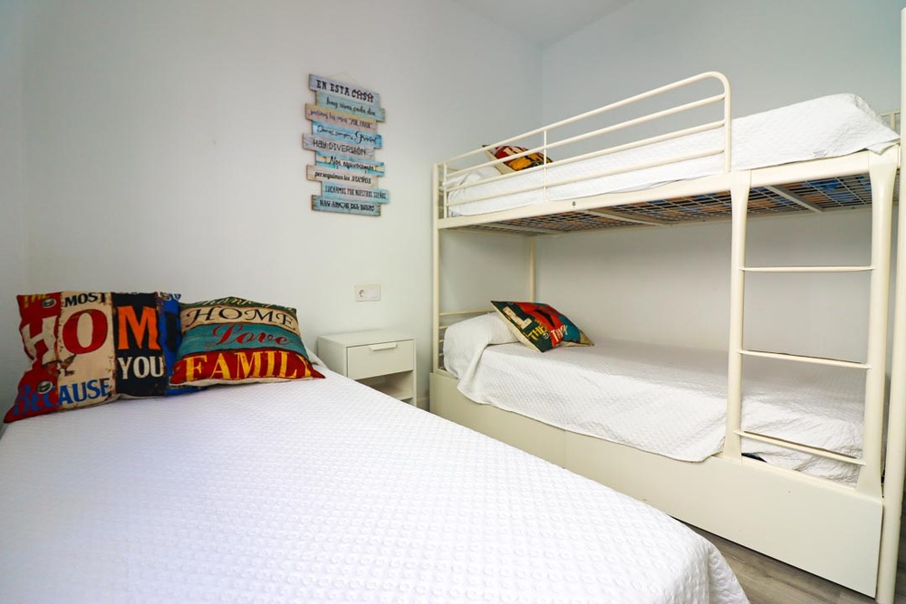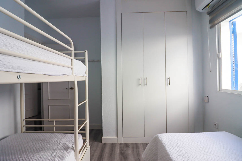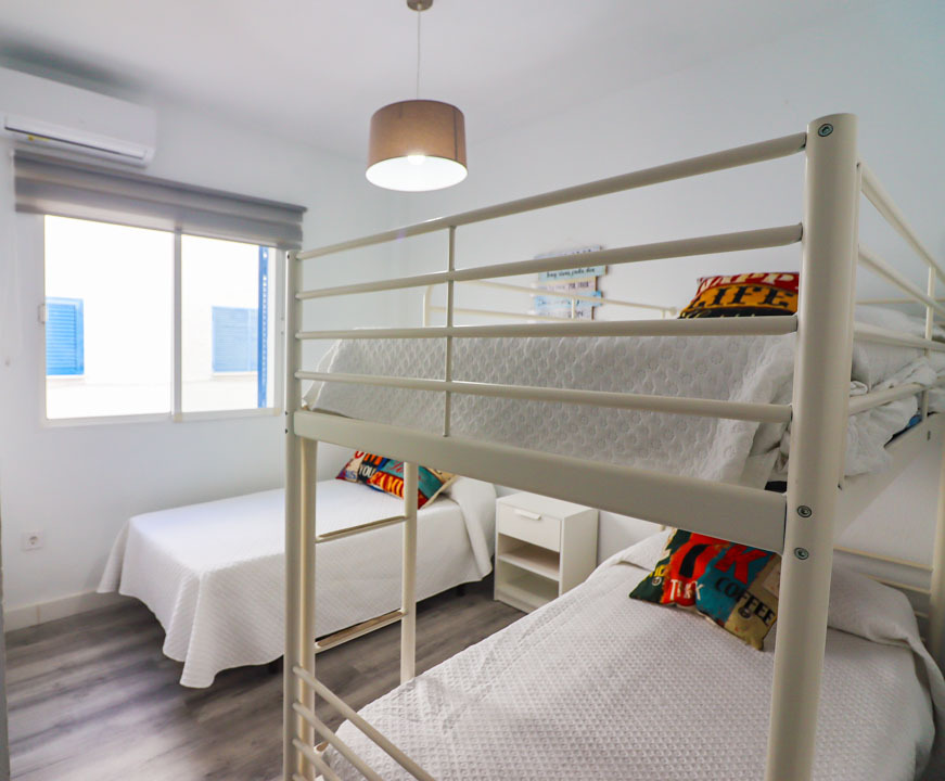 Apartamento de alquiler en la Barrosa con dos dormitorios, uno de matrimonio y el otro con cama individuale y literas, con capacidad máxima de 5 personas. A/C en salón y habitaciones. Se necesita bajar 3 escalones para el salón. Dispone de plaza de aparcamiento.